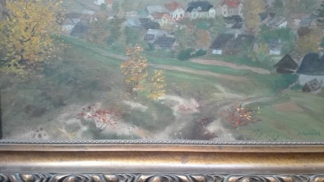 EinleitungFotoalbumJuříček Antonín - Pohled na vesnici 1931 - olej-kombinov. , překližka , 48x68, dobový zlacený rám ,